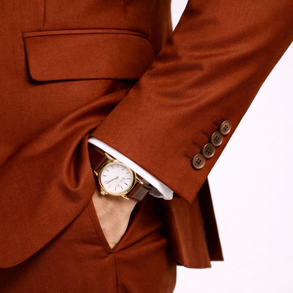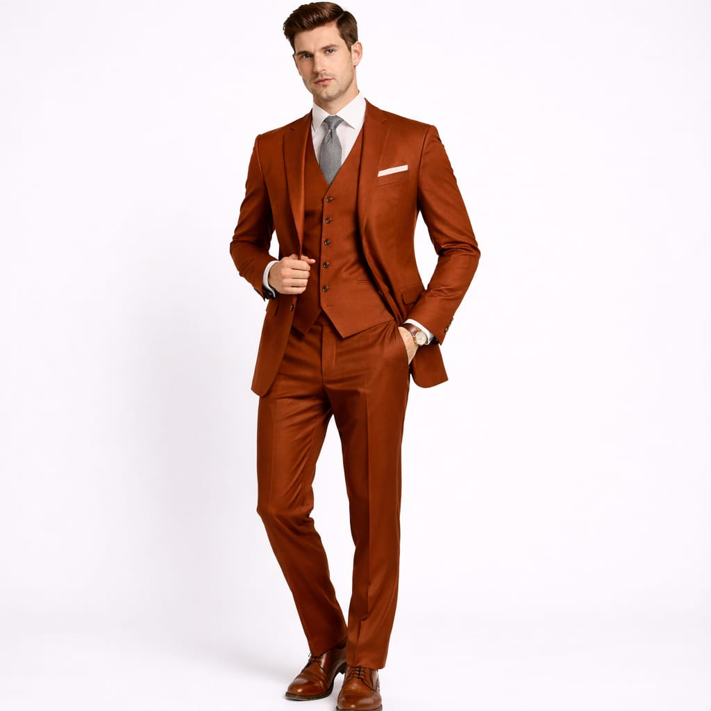 The Copper Single Breasted Three Piece Suit is a bold statement of warmth and modern refinement. This ensemble allows you to project an image of creative confidence and effortless luxury at autumnal weddings, evening galas, or high profile social events. The deep, metallic copper tone offers a rich visual texture that stands as a vibrant alternative to standard seasonal colors.